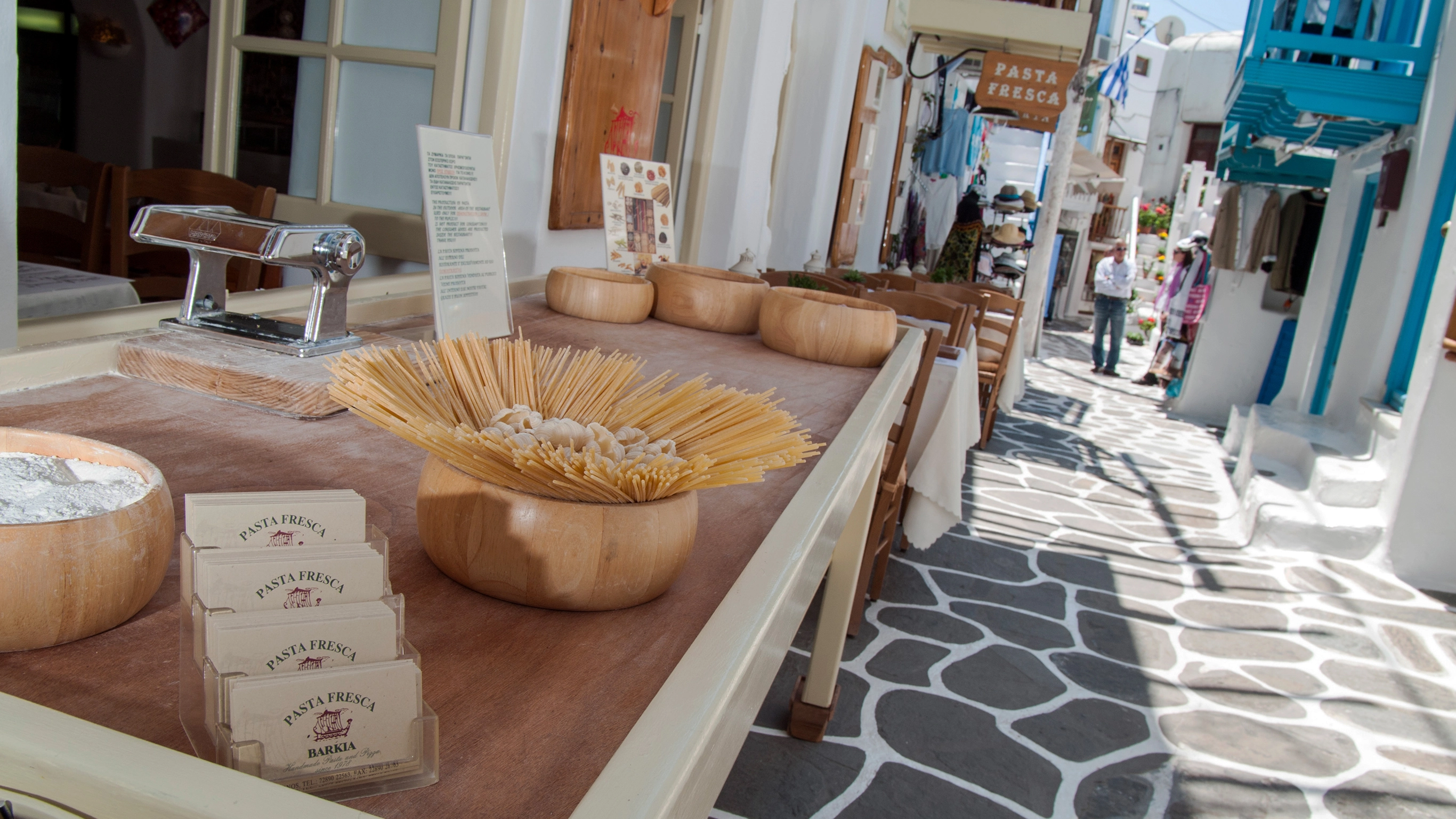 Coming from Mykonos town – head towards the new port, you’ll see the sailing boats on the left and on your right will be the Arista supermarket. Keep going for 200m and turn right to find Molaraki Restaurant, 50 metres to the right of Matthews Taverna (our former meeting point).